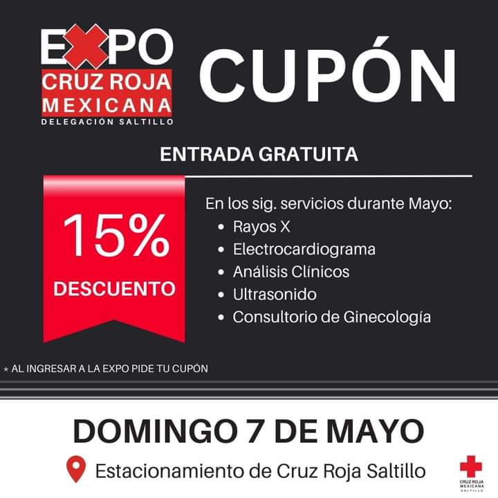 La delegación Saltillo de la Cruz Roja informó que el próximo domingo 7 de mayo durante las actividades de la primera edición de la Expo Cruz Roja Mexicana, obsequiará a los saltillenses que asistan a dicho evento cupones del 15 por ciento de descuento que podrán ser utilizados al solicitar cualquiera de los servicios que ofrece la humanitaria institución, como rayos x, electrocardiograma, análisis clínicos, ultrasonido y consulta ginecológica, entre otros.