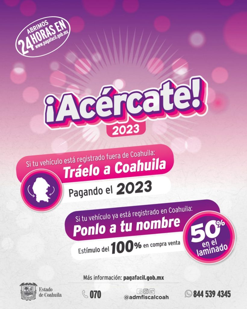 Con el programa “Ponlo a tu nombre”, para los contribuyentes que su vehículo está registrado en Coahuila y está al corriente en los pagos del Ejercicio Fiscal 2022 pero no se encuentra a su nombre, obtiene estímulos del 100 por ciento en el costo de compra venta y 50 por ciento de descuento en el laminado.