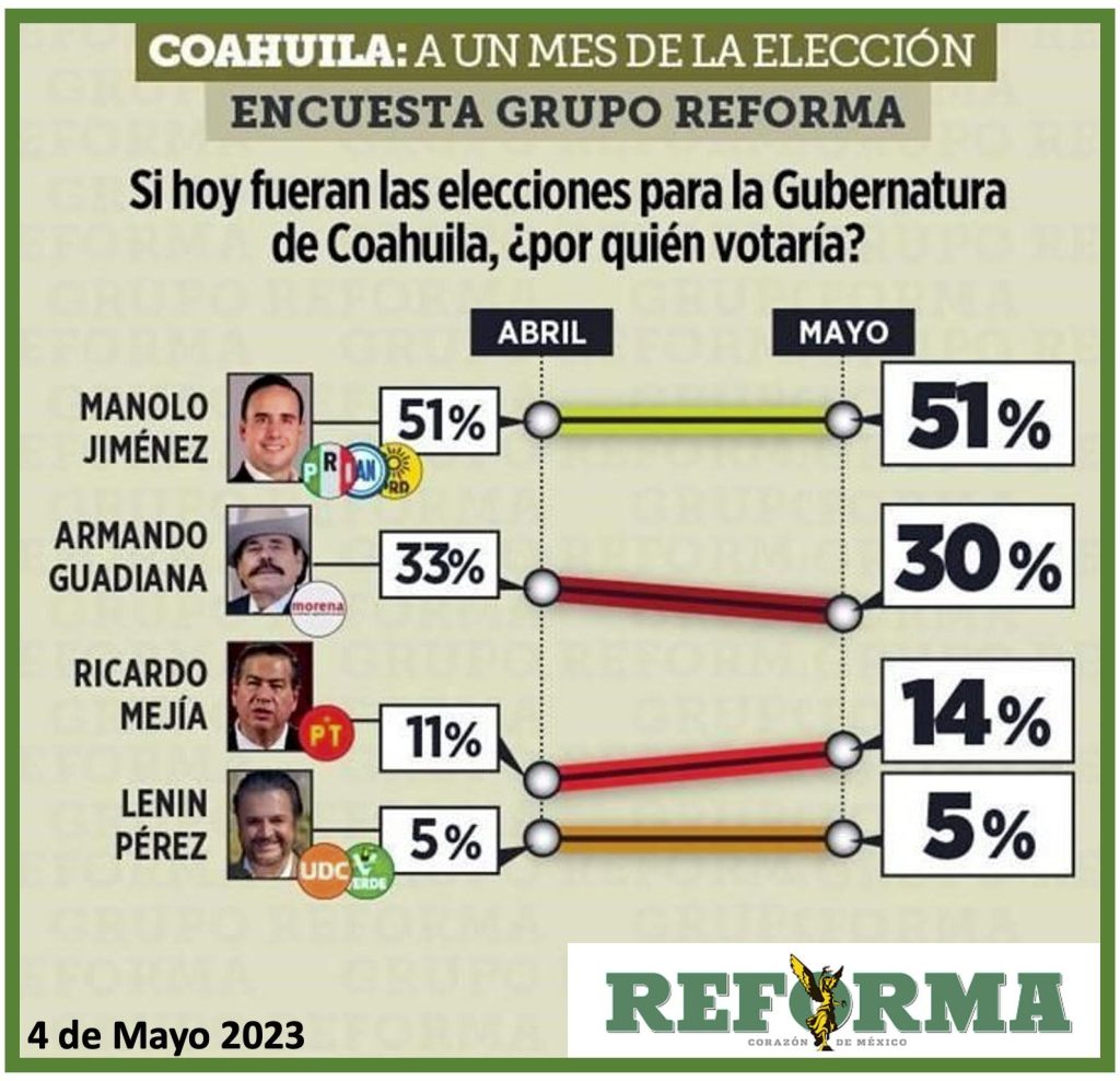 A exactamente un mes de la elección en Coahuila, Manolo Jiménez, de la alianza PRI-PAN-PRD, mantiene el liderato en la carrera por la Gubernatura, mientras que Armando Guadiana queda rezagado en un lejano segundo lugar; Ricardo Mejía del PT se le acerca y el candidato de UDC/PVEM Lenin Pérez se mantiene estático, revela una encuesta de Grupo Reforma.