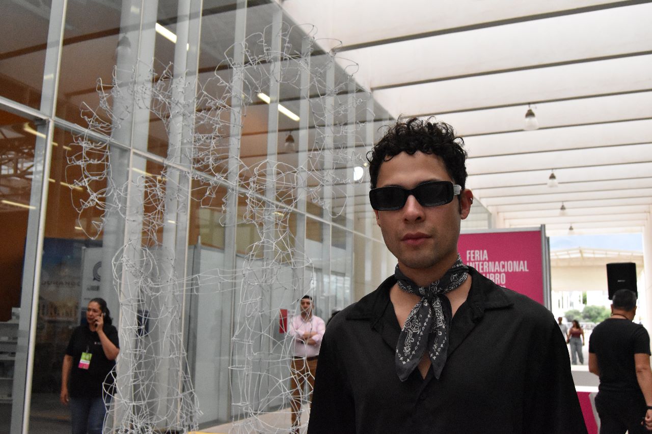 El autor comentó que la obra “El espejo es el salvador” se realizó durante 8 horas diarias durante los 9 días que lleva la FILC, la pieza está conformada por casi 8 kg de alambre recocido y pintura blanca, en la que se puede apreciar a dos personas interactuando, una de ellas toca con su mano el corazón de la otra y en la parte superior de ambas existen dos círculos realizados por diversas caras de alambre.