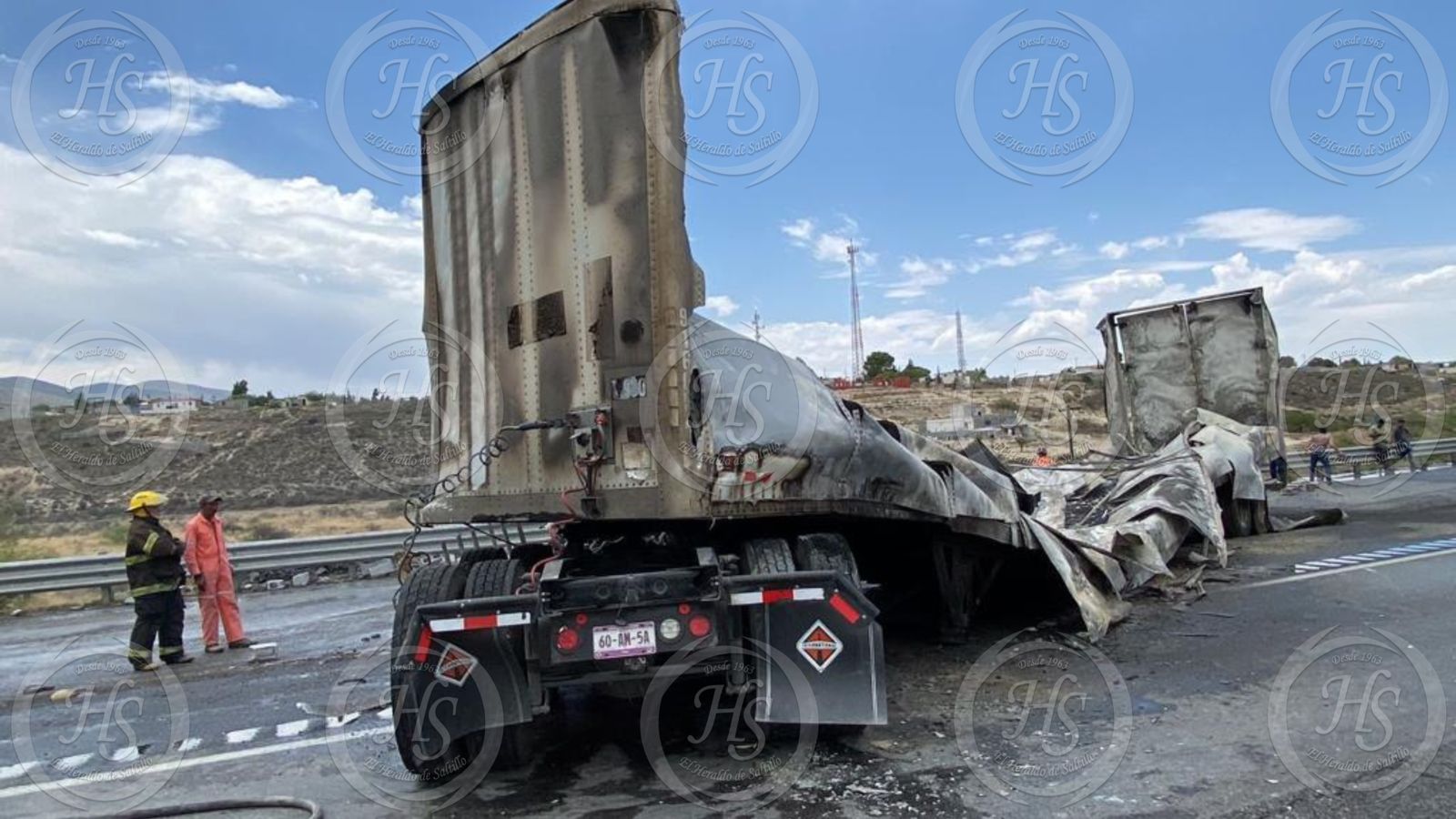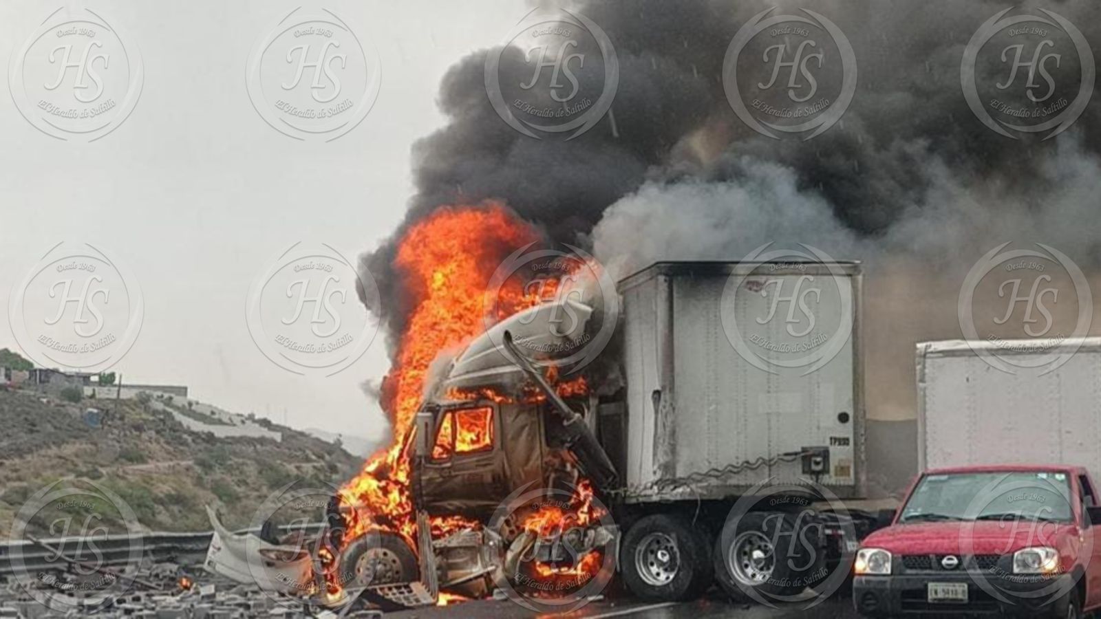 El conductor de un transporte de carga se impactó por alcance en contra de un camión materialista y se registró un voraz incendio.