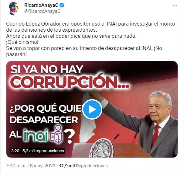 Se van a topar con pared en su intento de desaparecer al INAI. ¡No pasarán! pic.twitter.com/aB1bojdOD7— RicardoAnayaC (@RicardoAnayaC) May 8, 2023