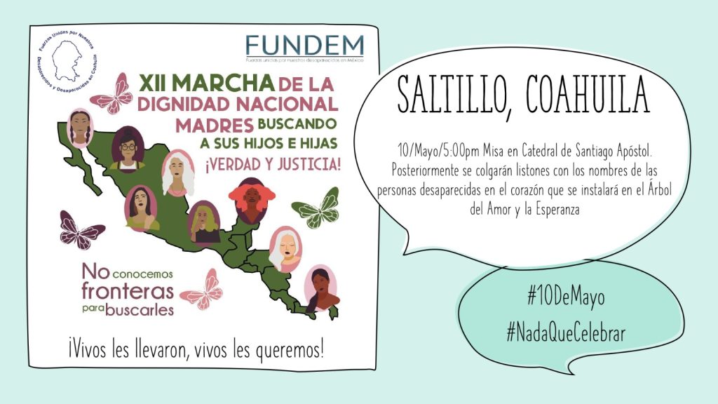 En Coahuila, el movimiento Fuerzas Unidas por Nuestros Desaparecidos en Coahuila avisó que también se unirá a la XII Marcha de la Dignidad Nacional Madres Buscando a sus hijos e hijas y convocaron a esta marcha el 10 de mayo a las 9:00 de la mañana, en la Plaza Mayor de Torreón, mientras que en Saltillo se realizará una misa a las 5:00 de la tarde en la Catedral de Santiago para posteriormente colgar listones con los nombres de las personas desaparecidas en el corazón que se instalará en el Árbol del Amor y la Esperanza.