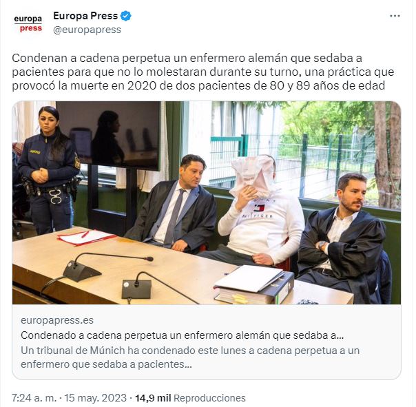 Condenan a cadena perpetua un enfermero alemán que sedaba a pacientes para que no lo molestaran durante su turno, una práctica que provocó la muerte en 2020 de dos pacientes de 80 y 89 años de edad https://t.co/BDpJfY8rx9