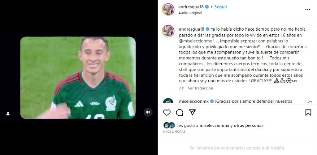“Ya lo había dicho hace tiempo pero no me había parado a dar las gracias por todo lo vivido en estos 16 años en @miseleccionmx! … imposible expresar con palabras lo agradecido y privilegiado que me siento!! … Gracias de corazón a todos los que me acompañaron y tuve la suerte de compartir momentos durante este sueño tan bonito! …. Todos mis compañeros, los diferentes cuerpos técnicos, toda la gente de staff que son parte importantísima del día a día y por supuesto a toda la fiel afición que me acompañó durante todos estos años que ahora soy uno más de ustedes ! GRACIAS!!!”, escribió el “Principito” en su cuenta de Instagram.)