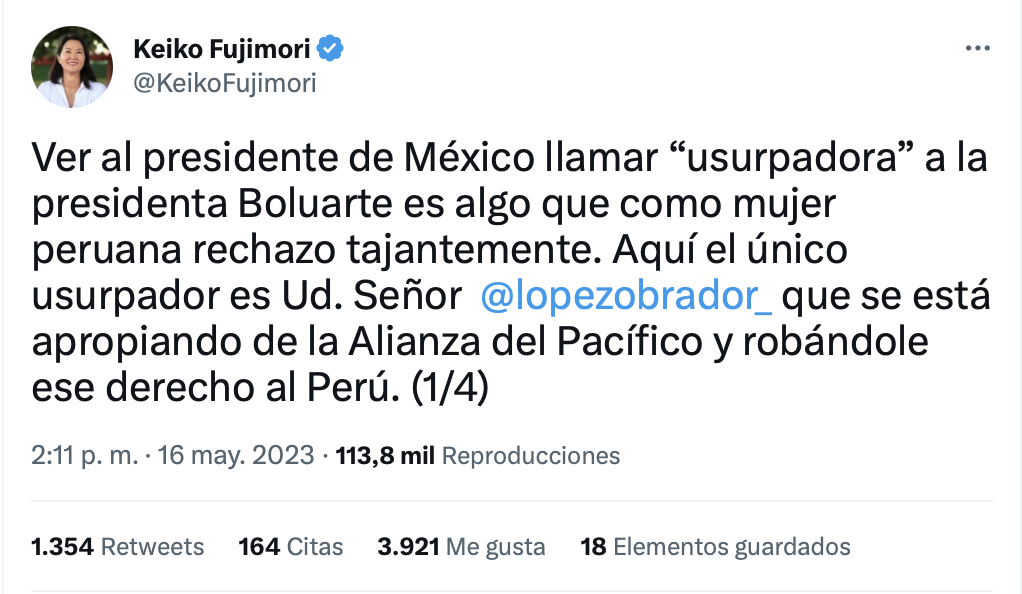 A través de Twitter, Fujimori expresó su apoyo a Boluarte, a pesar de ser de un partido de oposición. «Ver al presidente de México llamar ‘usurpadora’ a la presidenta Boluarte es algo que como mujer peruana rechazo tajantemente. Aquí el único usurpador es Ud. Señor @lopezobrador, que se está apropiando de la Alianza del Pacífico y robándole ese derecho al Perú.