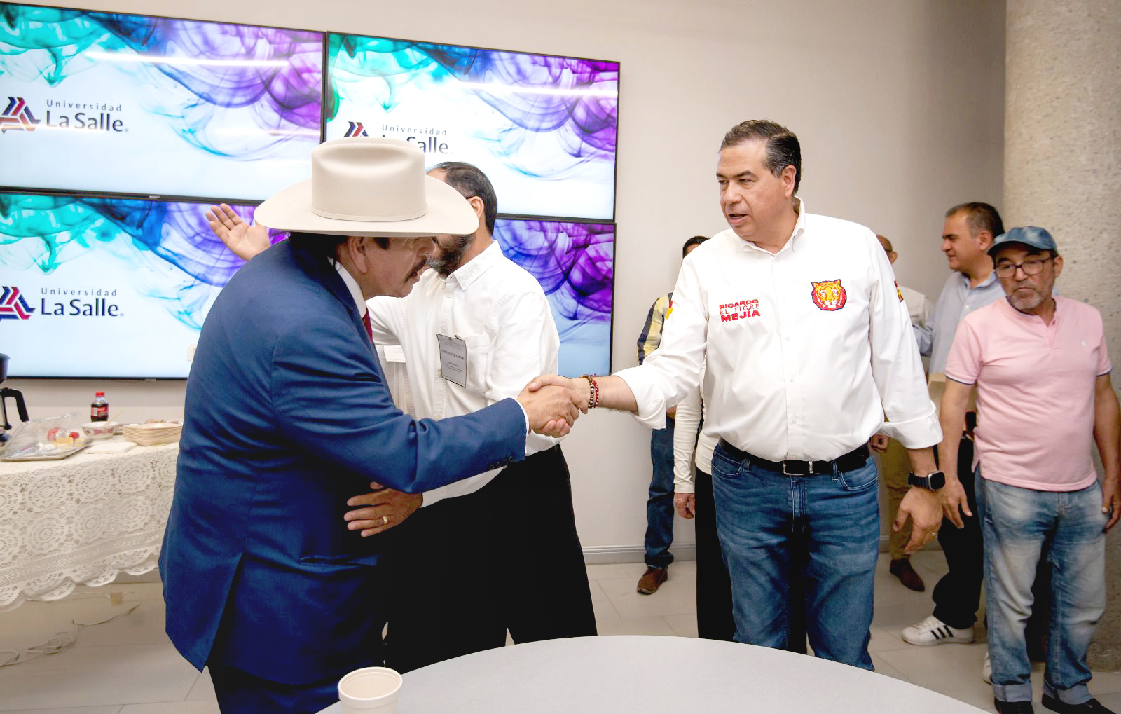 Alberto Guadiana Tijerina, candidato de Morena a la gubernatura de Coahuila, y Ricardo Mejía Berdeja, candidato del PT al mismo cargo, coincidieron el pasado lunes en las instalaciones de la Universidad La Salle (ULSA), Campus Saltillo, en dónde ambos acudieron a un evento convocado por un reducido grupo de maestros. En el evento, los seguidores de Mejía no dejaron de abuchear a Guadiana.