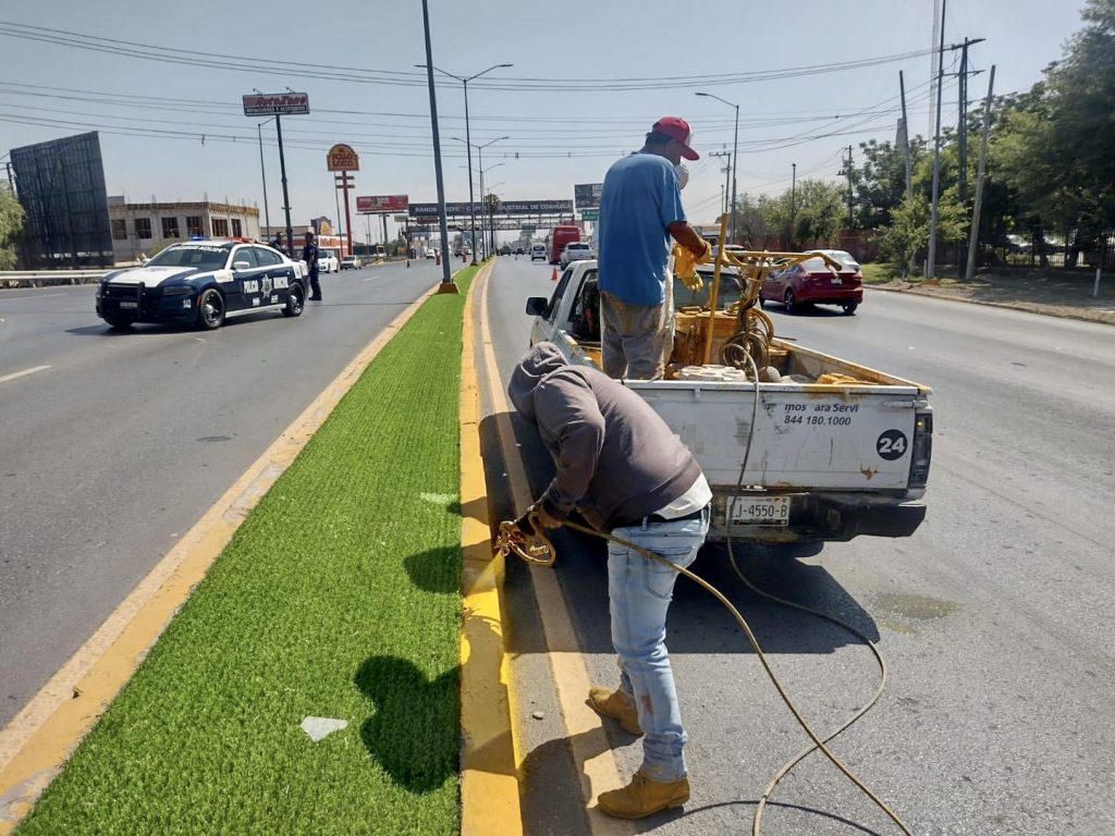 El carril de alta velocidad en su sentido de sur a norte, del puente vehicular conocido como La Reyna hacia la empresa De Acero sobre el bulevar ‘Miguel Ramos Arizpe’, se cerró a la circulación durante este martes por varias horas para realizar trabajos de limpieza, como corte de hierba y quitar la pintura dañada del camellón central.