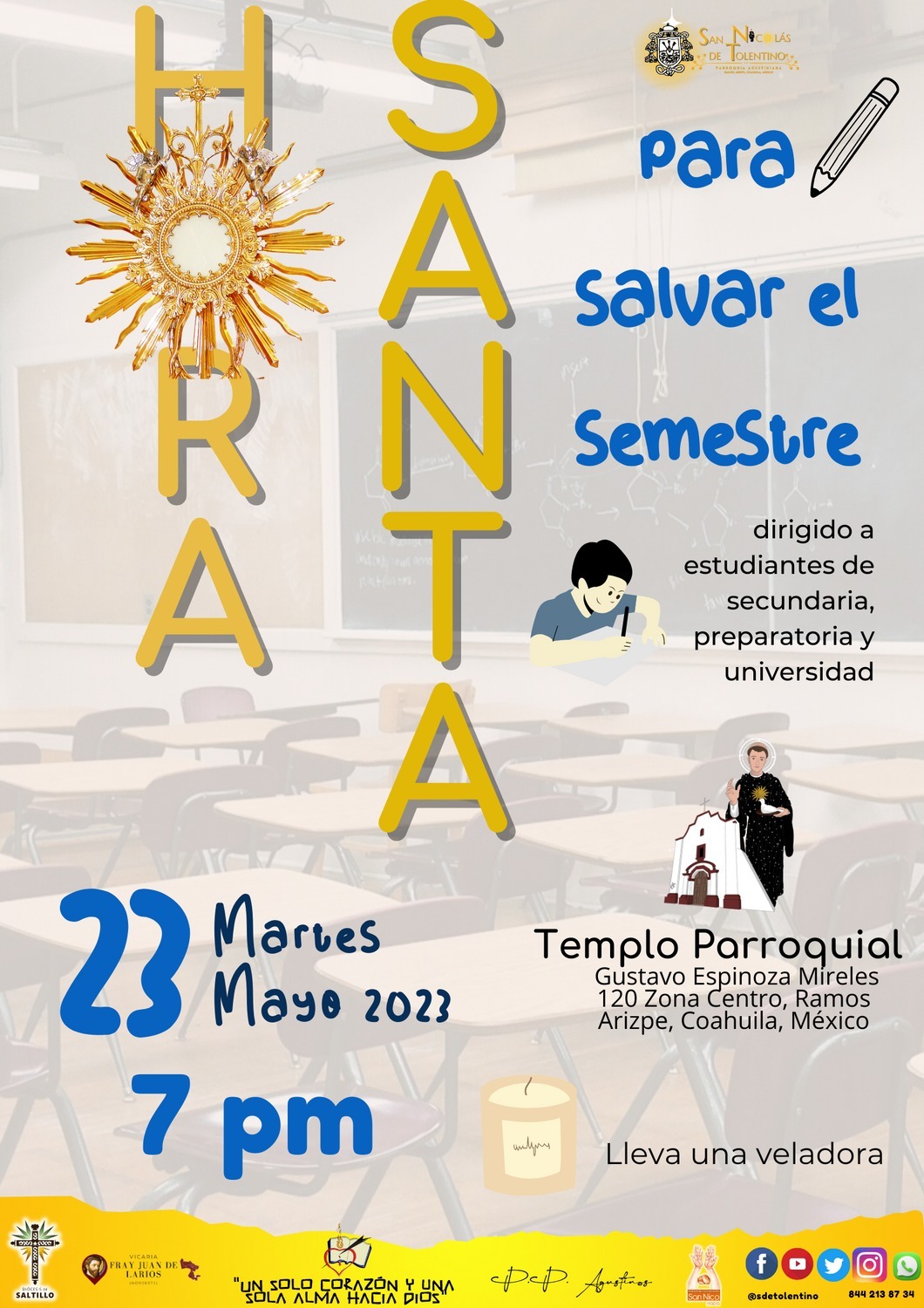 Este próximo martes 23 de mayo en punto de las 19:00 horas en la parroquia de San Nicolás de Tolentino en Ramos Arizpe, invitan a la misa y hora santa denominada “Para Salvar el Semestre” dirigido a estudiantes de secundaria, preparatoria y universidad con la intención de hacer un silencio interior a través de la oración para dar gracias por la culminación del año escolar, informó el párroco Francisco Peña Flores.