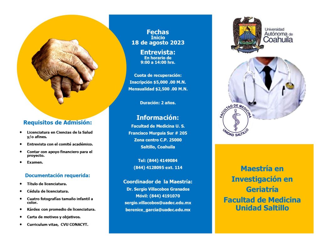 La Facultad de Medicina Unidad Saltillo de la Universidad Autónoma de Coahuila, invita a egresados de Licenciatura en Ciencias de la Salud o carreras afines a cursar la Maestría en Investigación en Geriatría, cuyas clases iniciarán el 18 de agosto de 2023.
