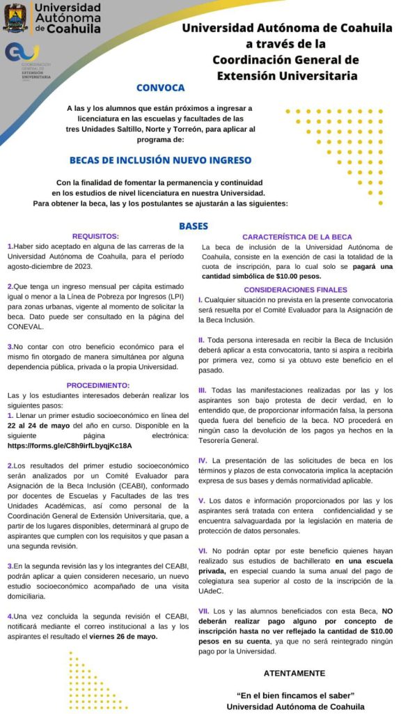 Con la finalidad de fomentar la permanencia y continuidad en los estudios de nivel licenciatura, la Universidad Autónoma de Coahuila a través de la Coordinación General de Extensión Universitaria, convoca a las y los alumnos que están próximos a ingresar a licenciatura en las Escuelas y Facultades de las tres Unidades Saltillo, Torreón y Norte, a aplicar en el Programa de Becas de Inclusión Nuevo Ingreso.
