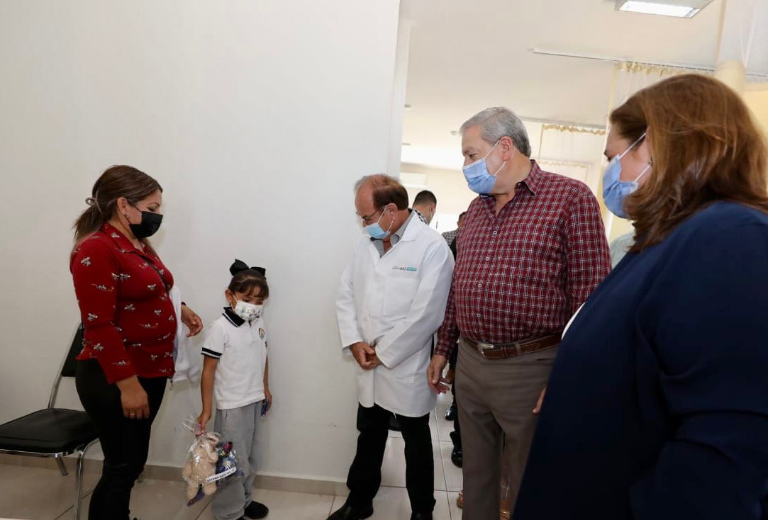 El alcalde José María Fraustro Siller, acompañado por su esposa Beatriz Dávila de Fraustro, presidenta honoraria del DIF Saltillo, y por Roberto Bernal Gómez, secretario de Salud del Estado, supervisaron la aplicación en las instalaciones de la Unidad Básica de Rehabilitación.