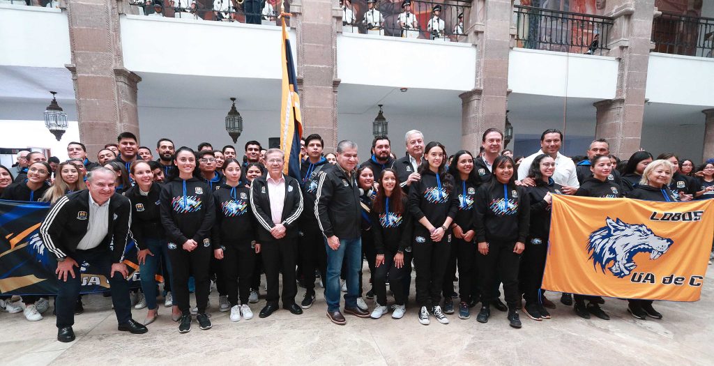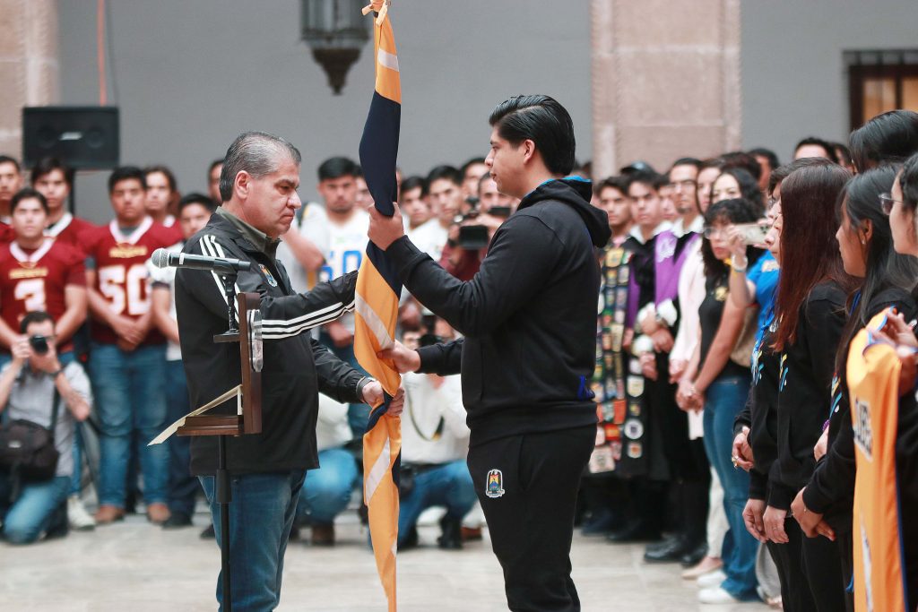 El estandarte universitario fue entregado por el mandatario estatal y recibido por la escolta conformada por Benjamín Pérez (Tae Kwon Do), Félix Mireles (Levantamiento de pesas), Pedro Casas (Box), Doyel Olague (Gimnasia), Lidia Gámez (Softbol) y Andrea López (Lucha).