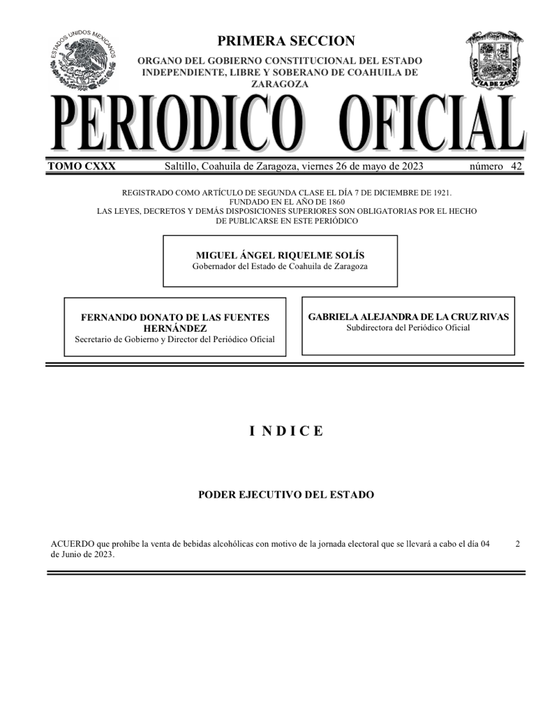 La Secretaría de Gobierno del Estado de Coahuila de Zaragoza emitió un Acuerdo que prohíbe la venta de bebidas alcohólicas con motivo de la jornada electoral que se llevará a cabo el próximo día 4 de junio.