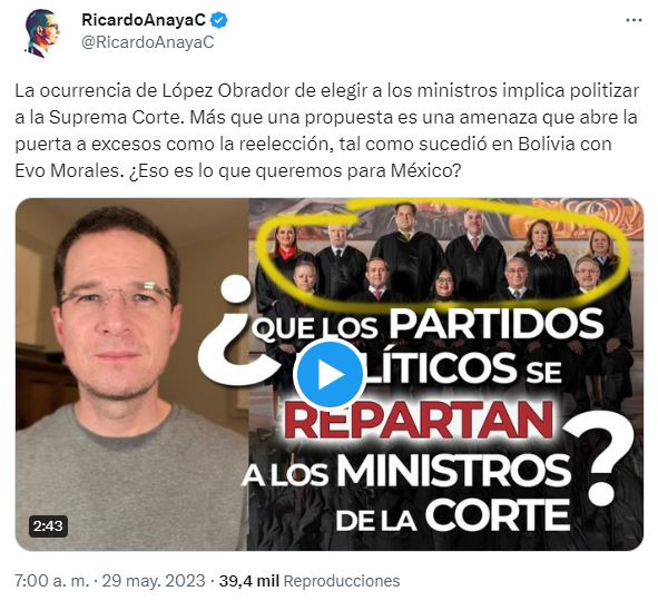 “¿De verdad queremos que los partidos políticos se repartan a los ministros de la Corte? ¿De verdad queremos politizar al máximo tribunal del país? Eso es lo que implica que sean electos por votación, como los diputados y los senadores”, dijo Anaya a través de un video que compartió en redes sociales.