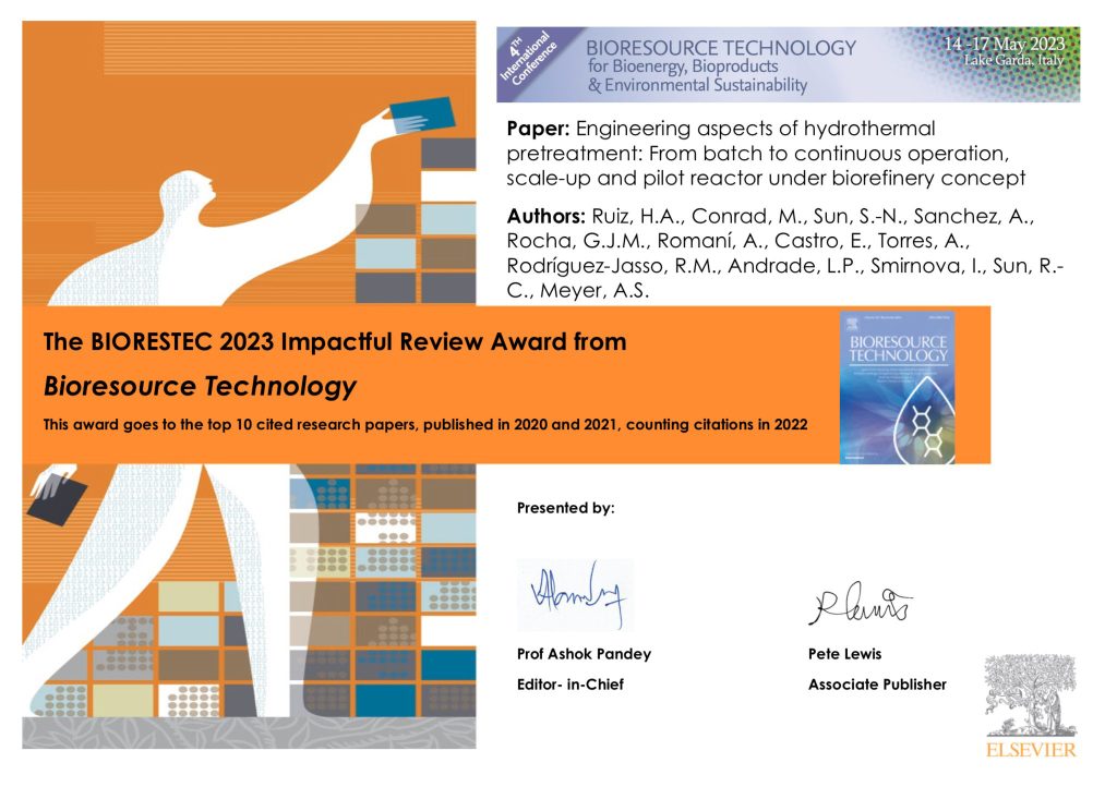 El artículo científico “Aspectos de ingeniería del pretratamiento hidrotérmico: De la operación en modo por lote hasta continuo, escalamiento y reactor piloto bajo el concepto de biorrefinería” de los profesores e investigadores de la Facultad de Ciencias Químicas de la Universidad Autónoma de Coahuila, Dra. Rosa María Rodríguez Jasso y el Dr. Héctor Arturo Ruíz Leza, fue galardonado dentro del Top 10 como uno de los trabajos de investigación más citados, publicados entre 2020 y 2021, contando con citas en 2022.