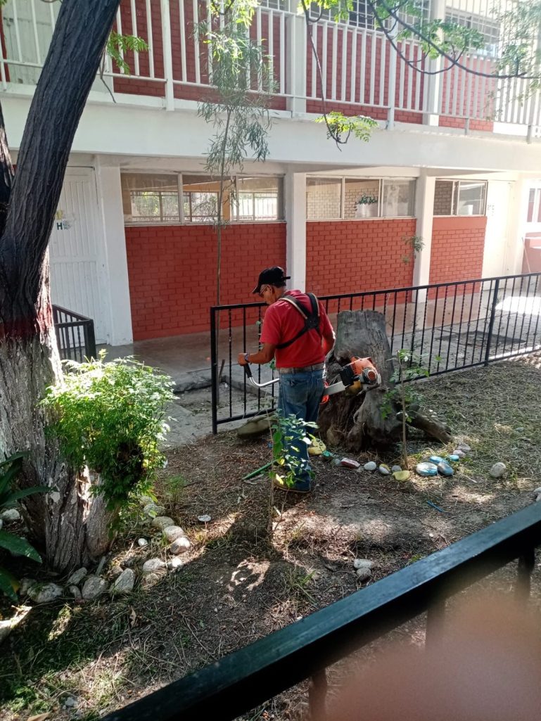 El personal apoya con acciones diversas como retiro de basura y hierba, revisión de tomas de agua y sanitarios para garantizar su correcto funcionamiento el día de la jornada.