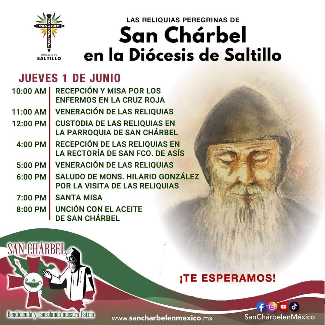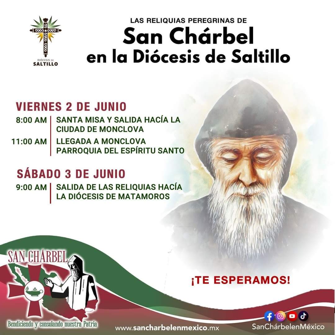 A través de una circular, la Diócesis de Saltillo dio a conocer que las reliquias peregrinas de San Charbel llegarán a la capital coahuilense el próximo primero de junio de este 2023, con un recorrido que comenzará en la sede de la Cruz Roja de Saltillo a las 10:00 de la mañana, donde se recibirán con una misa por los enfermos. En el lugar también se realizará una veneración de las reliquias, a las 11:00 de la mañana.