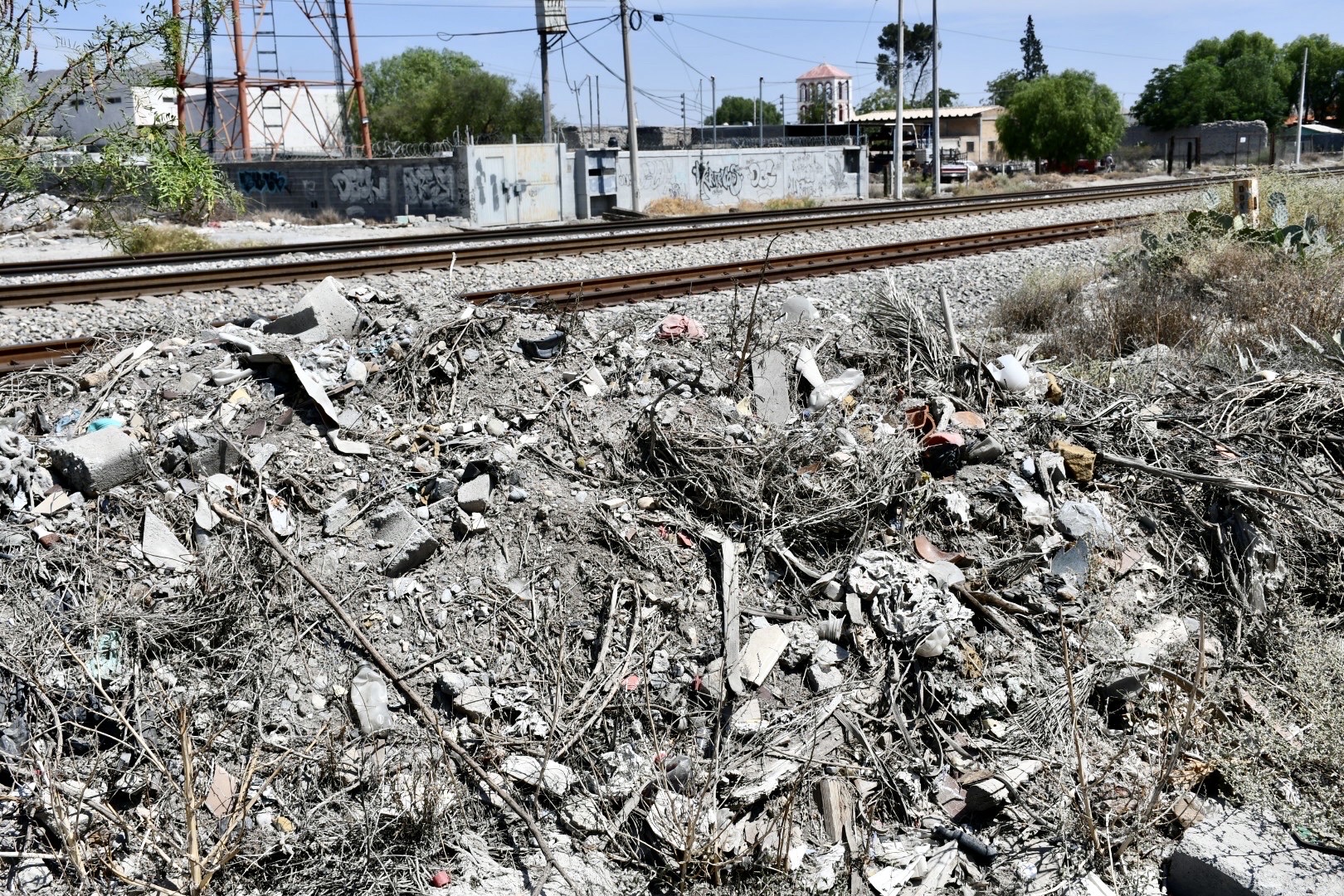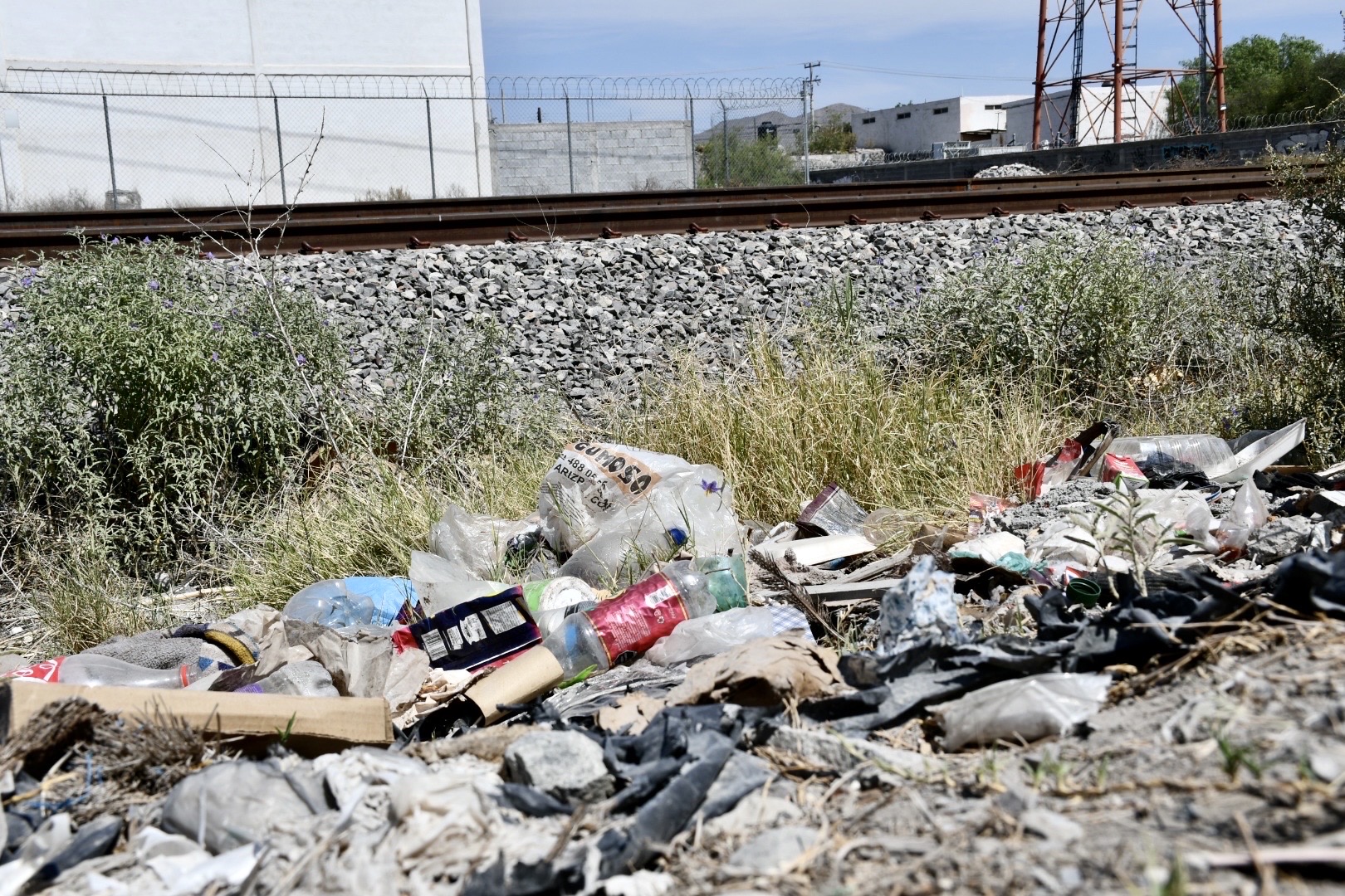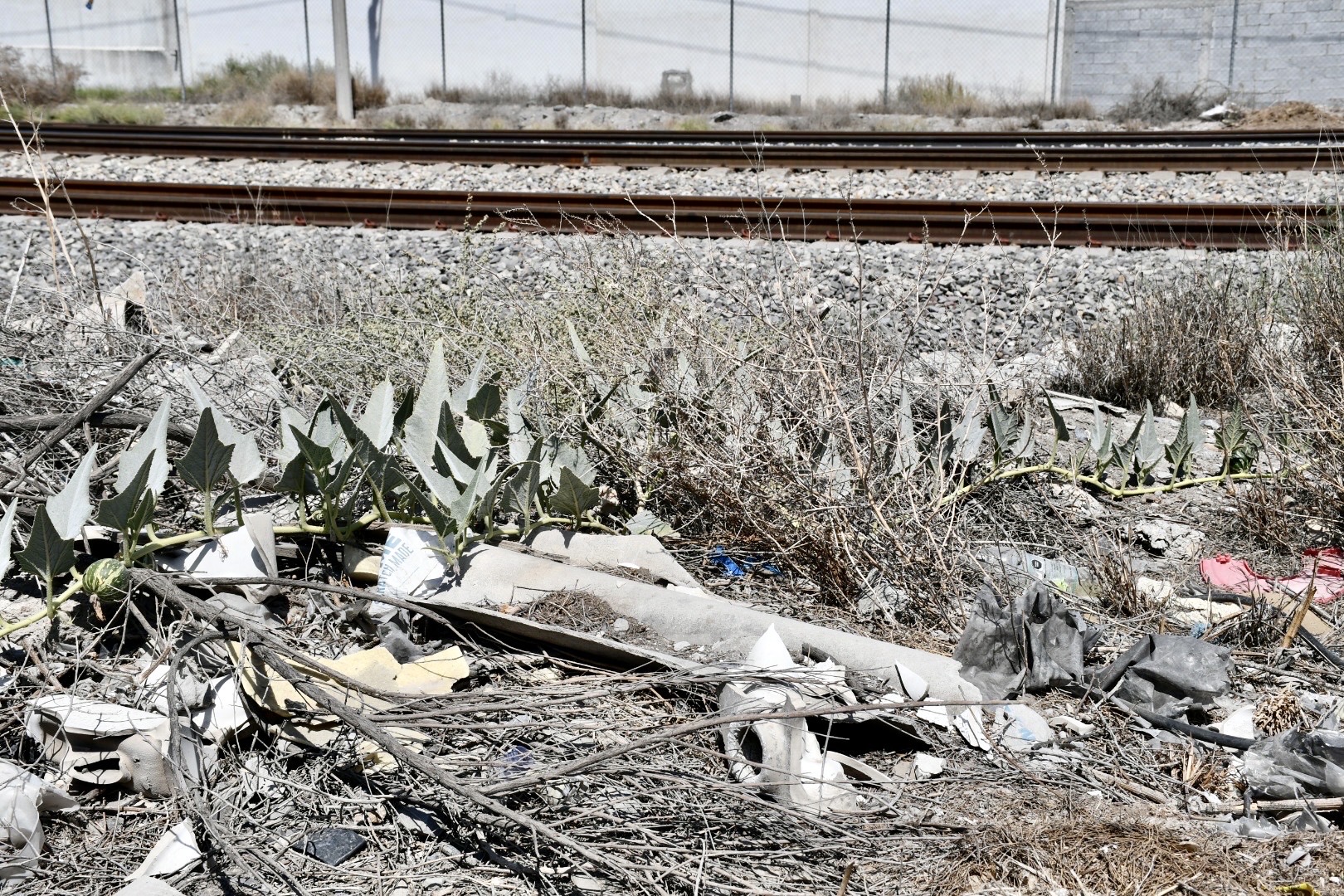 Entre la maleza abunda la acumulación de basura que de forma inconsciente y desmedida continúa siendo arrojada en los costados de las vías del tren, ubicadas a la altura de la calle Ignacio Zaragoza con dirección hacia la carretera Los Pinos, en el sector de la colonia La Esmeralda en Ramos Arizpe.