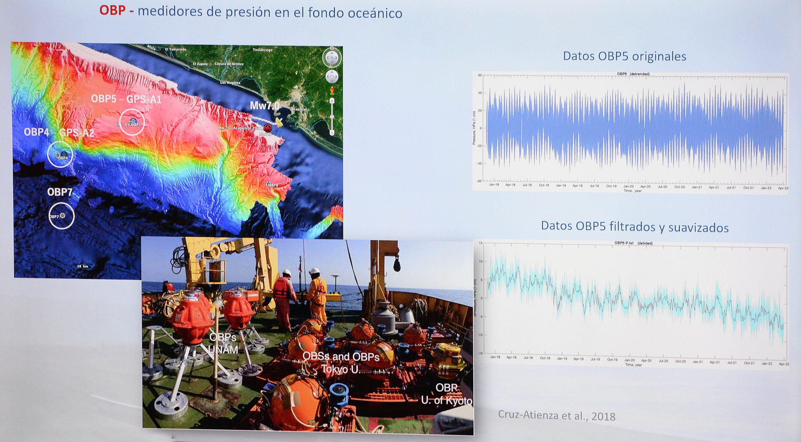El estudio, llevado a cabo durante seis años en la Brecha Sísmica de Guerrero, implicó la instalación de estaciones geodésicas en el fondo marino. Entre los aparatos de medición destacan los inclinómetros que miden el movimiento del fondo oceánico tras el sismo lento, detalló Víctor Manuel Cruz Atienza, investigador del IGEF y líder del proyecto.