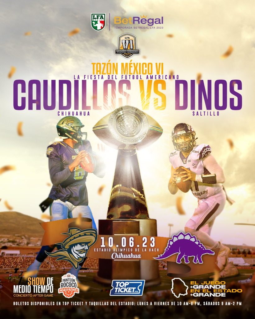 La fiesta pinta color azul y oro en Chihuahua con la llegada de Caudillos al Tazón México VI convirtiéndose en el primer equipo que jugará en casa el gran partido, toda vez que la sede definida desde inicio de temporada es Chihuahua. Por si fuera poco, el boleto se selló venciendo al campeón reinante, Fundidores de Monterrey 34-20 y además continua la marcha invicta del equipo (11-0). (EL UNIVERSAL)