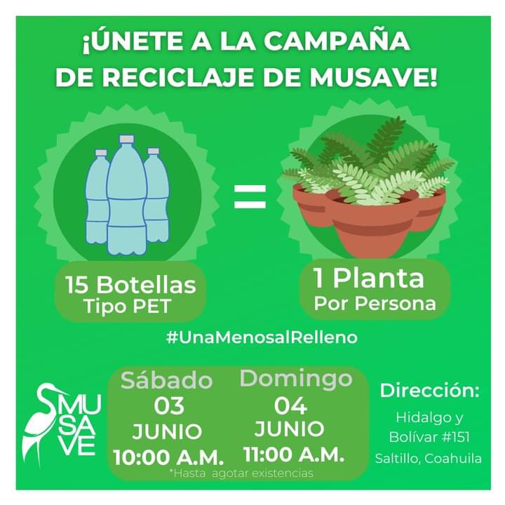 El Museo de las Aves invitó a los saltillenses a participar en la campaña de reciclaje que tendrá lugar este sábado 3 y domingo 4 de junio en instalaciones de ese recinto museográfico, donde a partir de las 10:00 de la mañana se estarán ofreciendo plantas suculentas por cada 15 botellas de PET que se entreguen, mismas que deberán estar preferentemente secas y limpias al momento de entregarse.