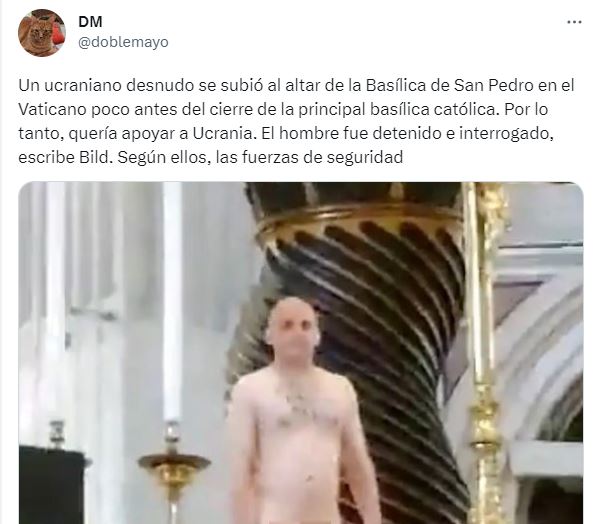 Un ucraniano desnudo se subió al altar de la Basílica de San Pedro en el Vaticano poco antes del cierre de la principal basílica católica. Por lo tanto, quería apoyar a Ucrania. El hombre fue detenido e interrogado, escribe Bild. Según ellos, las fuerzas de seguridad pic.twitter.com/Gd8te14ILm
