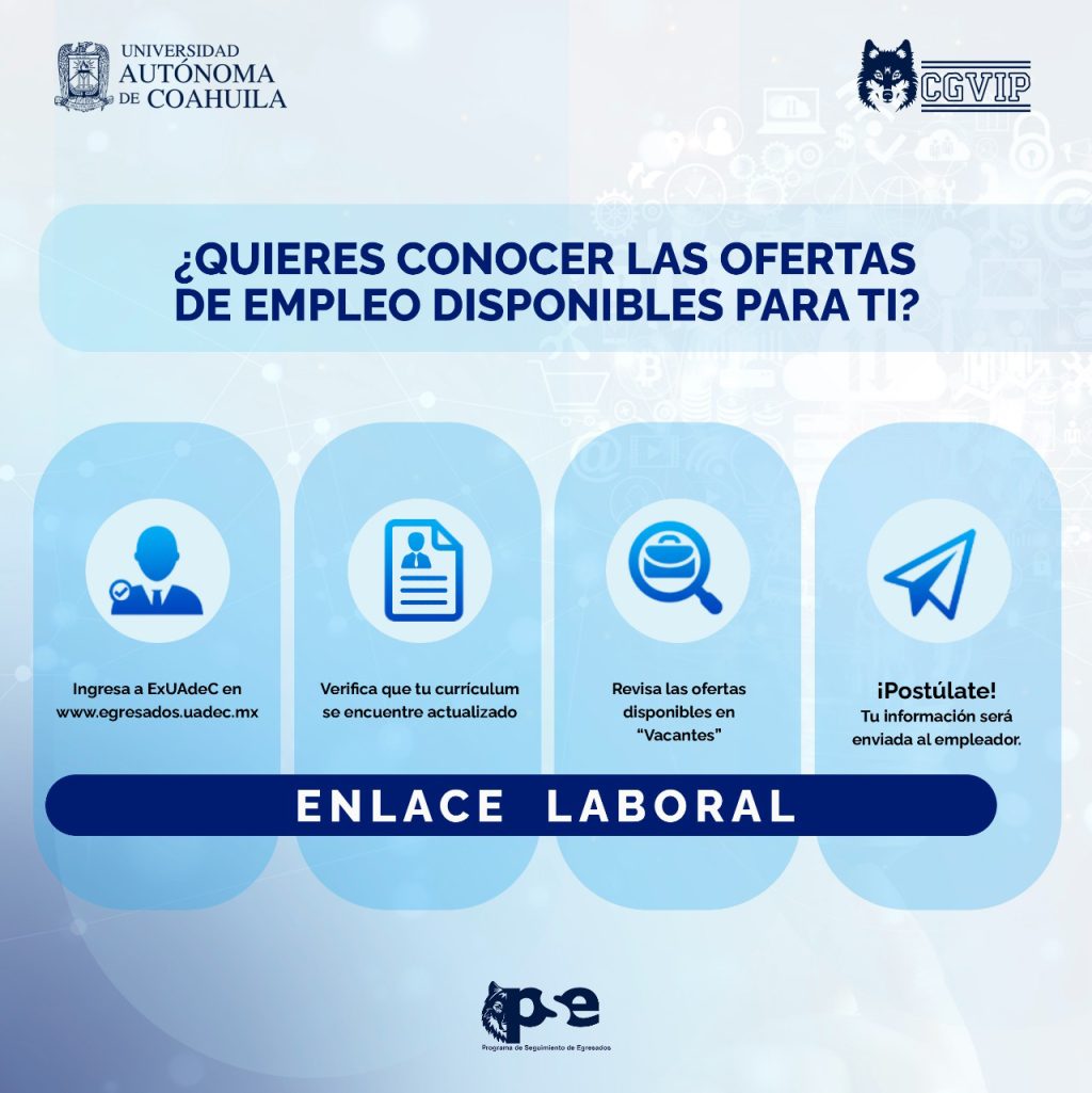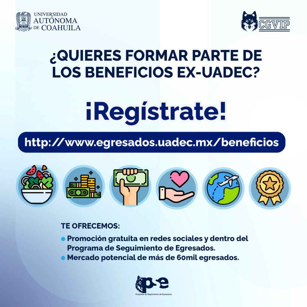Para conocer cómo se desenvuelven sus egresados en el área laboral y ofrecerles oportunidades de profesionalización, la Universidad Autónoma de Coahuila a través del Programa Institucional de Seguimiento de Egresados, invita a sus exalumnos a formar parte de esta iniciativa y aprovechar los beneficios de forma gratuita.
