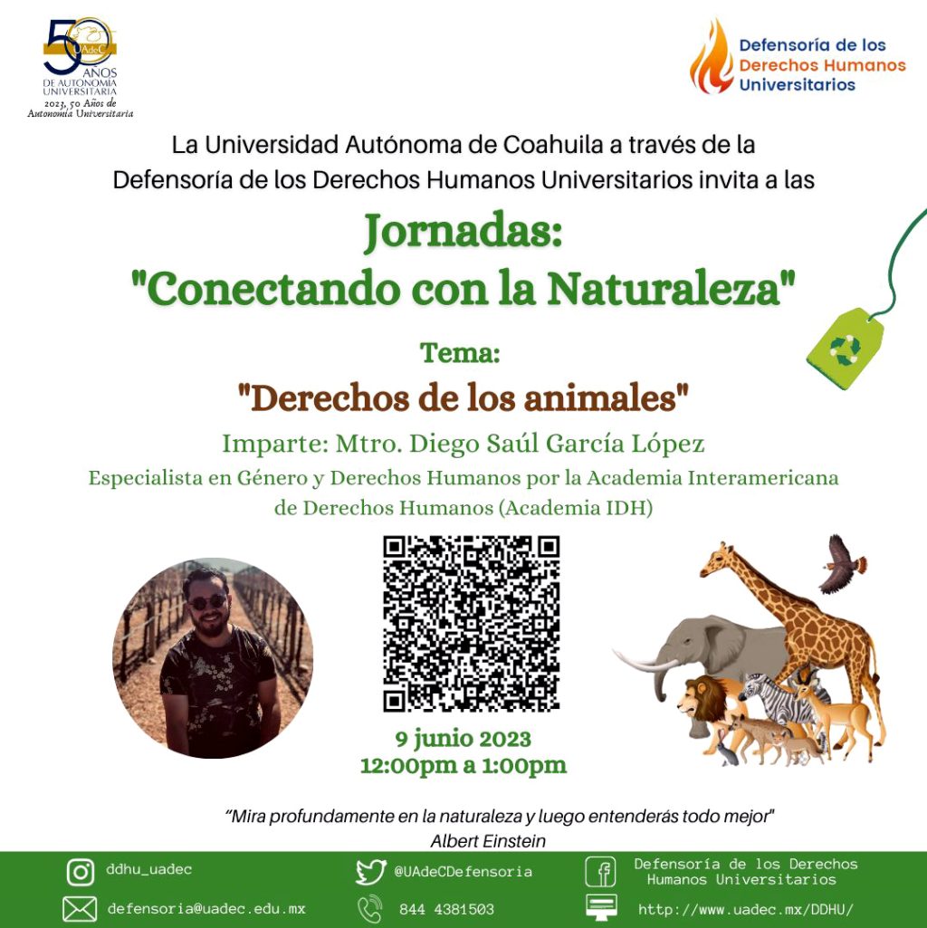 Posteriormente a las 12:00 horas iniciará la segunda charla de las Jornadas: Conectando con la Naturaleza con el tema “Derechos de los animales”, que será impartida por el Mtro. Diego Saúl García López, especialista en Género y Derechos Humanos por la Academia Interamericana de Derechos Humanos (AIDH).