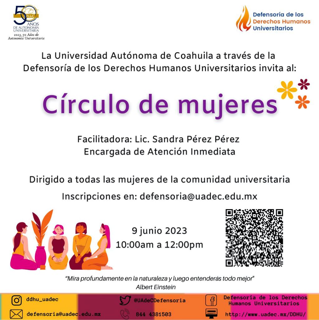 La Defensoría de los Derechos Humanos Universitarios (DDHU) de la Universidad Autónoma de Coahuila invita a la comunidad universitaria a participar en el “Círculo de Mujeres” y a las Jornadas: “Conectando con la Naturaleza”, los cuales se llevarán a cabo el 9 de junio de 10:00 a 12:00 y de 12:00 a 13:00 horas, respectivamente, a través de la plataforma Microsoft Teams.