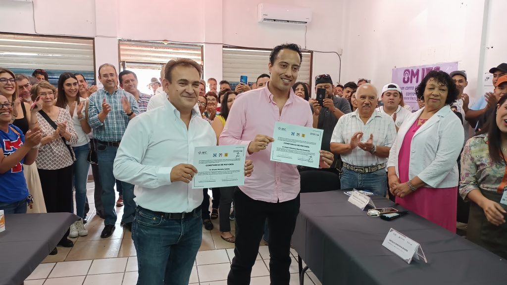 Acompañado del dirigente estatal del PRI, Rodrigo Fuentes Ávila, Álvaro Moreira arribo a las instalaciones del Comité Distrital del IEC, donde se le hizo entrega de la constancia a él y a su compañero de fórmula, Ángel Mahatma Sánchez Guajardo.
