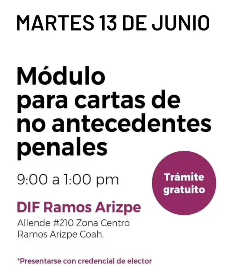 Para apoyar la economía de la ciudadanía, el DIF Ramos Arizpe, a través de la Secretaria de Seguridad Pública del Estado de Coahuila, pondrá en marcha este martes 13 de junio una jornada para realizar el trámite de las cartas de no antecedentes penales de manera gratuita, informó Jorge Gutiérrez Padilla, director de la institución.