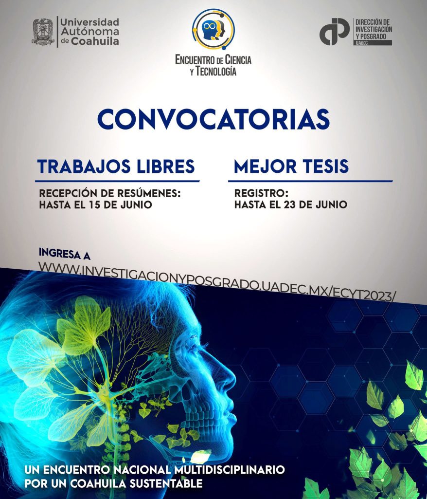 La Universidad Autónoma de Coahuila a través de la Dirección de Investigación y Posgrado convocan a la comunidad científica y académica a registrar sus trabajos para participar en el premio a la Mejor Tesis y Trabajo Libre en el “Encuentro de Ciencia y Tecnología 2023: Un Encuentro Nacional Multidisciplinario por un Coahuila Sustentable” (ECyT 2023), que se llevará a cabo el 7 de septiembre de 2023 en las instalaciones del Campus Arteaga.