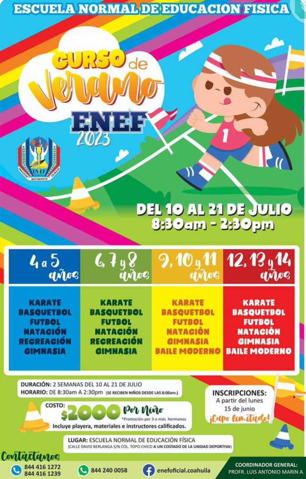 Para ofrecer a los niños y jóvenes de la capital coahuilense opciones de sana recreación, activación física y sano esparcimiento durante el próximo período de asueto por fin del ciclo escolar 2022-2023, la Escuela Normal de Educación Física (ENEF) de Saltillo ofrecerá sus cursos de verano para niños y adolescentes.