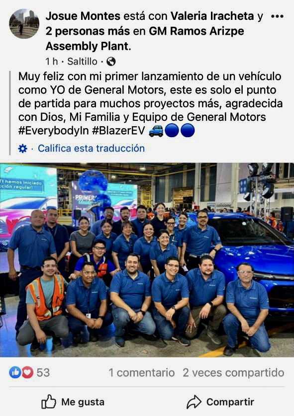 Este miércoles, en las publicaciones compartidas vía Facebook, se observa a parte del equipo posando junto al SUV eléctrico en la celebración de la primera unidad armada en la planta Ramos Arizpe.