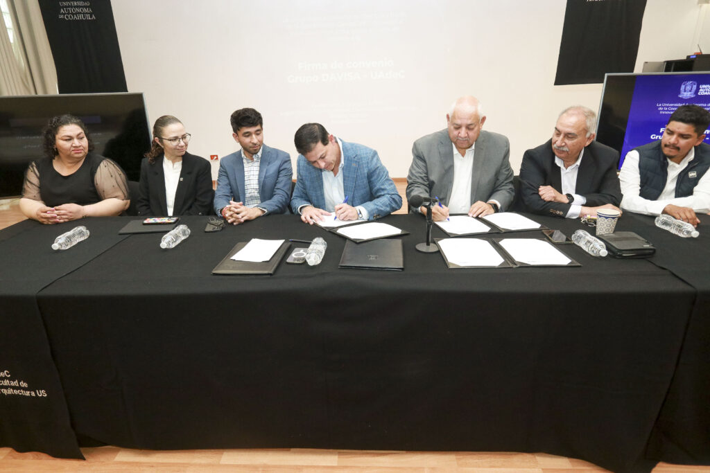El documento fue signado por el rector de la máxima casa de estudios, Octavio Pimentel Martínez y el director de Finanzas de Grupo DAVISA, Abelardo Garza Becerra, como testigos la coordinadora de Unidad Sureste, Eva Kerena Hernández Martínez, la coordinadora general de Vinculación e Innovación Productiva de la UA de C, Karla Patricia Valdés García, el director de la Facultad de Arquitectura, Jesús Alberto Padilla Garza, el gerente de Vinculación de Grupo DAVISA, José Pedro Morales Pequeño y el coordinador estratégico de Inserción Profesional UAdeC- DAVISA, Eduardo Villanueva.