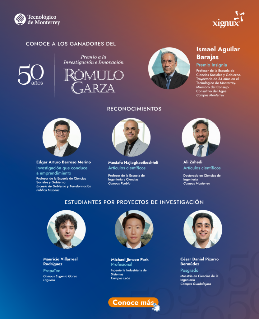 Monterrey, Nuevo León.- El Tecnológico de Monterrey y Xignux celebraron 50 años de impulso a la ciencia con la ceremonia de entrega del Premio a la Investigación y la Innovación Rómulo Garza. Establecido en 1975, este galardón ha impulsado el conocimiento científico y reconocido la investigación en áreas clave como la salud, el medio ambiente, la economía y la tecnología.