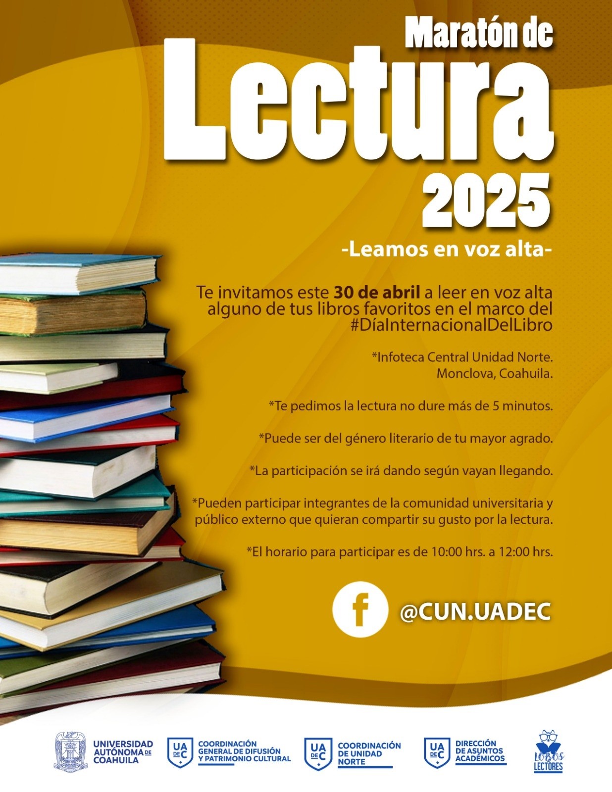 Con el objetivo de fomentar y fortalecer el gusto por la lectura, la Universidad Autónoma de Coahuila a través de la Coordinación General de Difusión y Patrimonio Cultural, las tres Unidades Sureste, Laguna y Norte, el Sistema de Infotecas Centrales, escuelas y dependencias, llevó a cabo el Maratón de Lectura en Voz Alta 2025, en donde universitarios, estudiantes, docentes y colaboradores participaron para conmemorar el Día Internacional del Libro.
