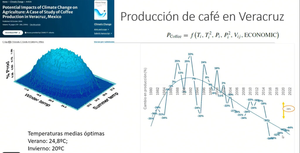 Estrada Porrúa rememoró que en 2006 él y su equipo de investigación calcularon qué pasaría con la producción de café en Veracruz en 2020 debido a modificaciones del clima, estimando que se perdería 24 por ciento. Ahora se observa que asciende a alrededor de 48 por ciento, lo que indica lo grave que son las consecuencias de este problema.