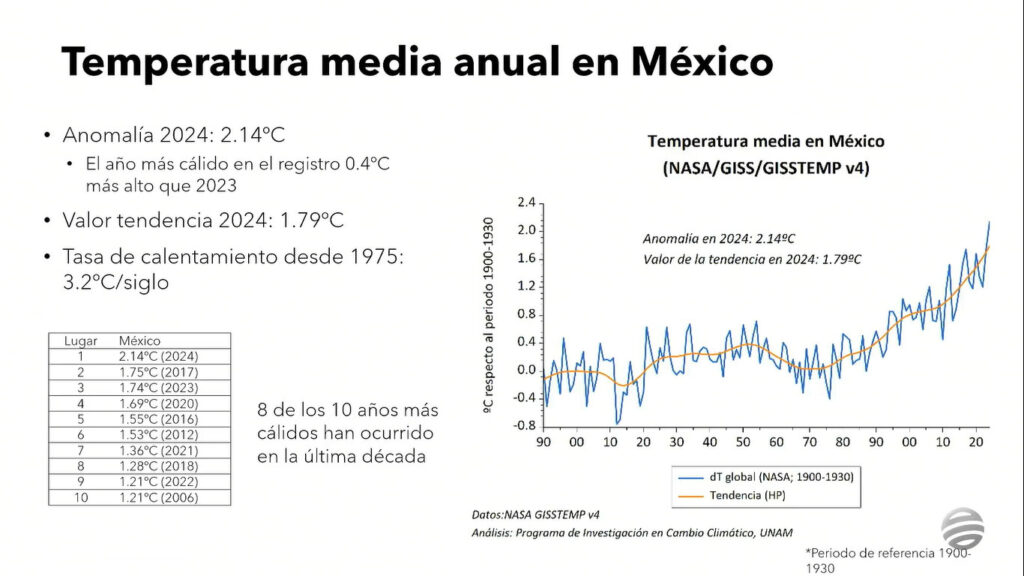 Para el caso específico de México, lo que se ve es que del periodo preindustrial al 2024 la temperatura ha subido en 1.8 grados; es decir, nos hemos calentado más que el promedio del planeta y la tasa de calentamiento es más grande. O sea que mientras el mundo lo hace aproximadamente 2 grados por siglo, en nuestro país es de 3.2 grados por siglo.
