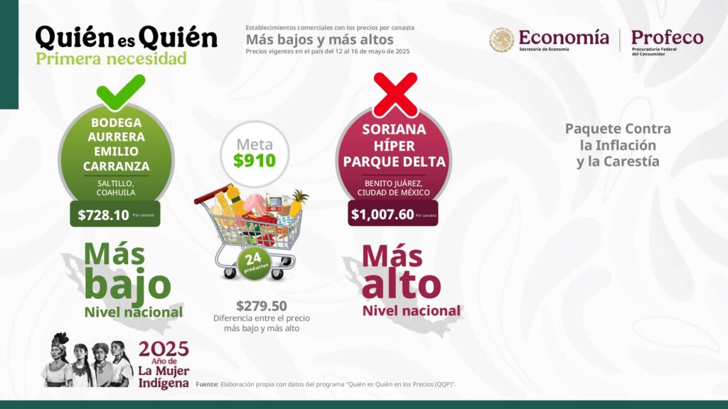 De acuerdo con el monitoreo semanal de precios correspondiente al periodo del 12 al 16 de mayo de 2025, presentado en la conferencia matutina del 26 de mayo, Bodega Aurrera Emilio Carranza, en Saltillo, vendió la canasta básica a 728.10 pesos, el precio más bajo registrado a nivel nacional.