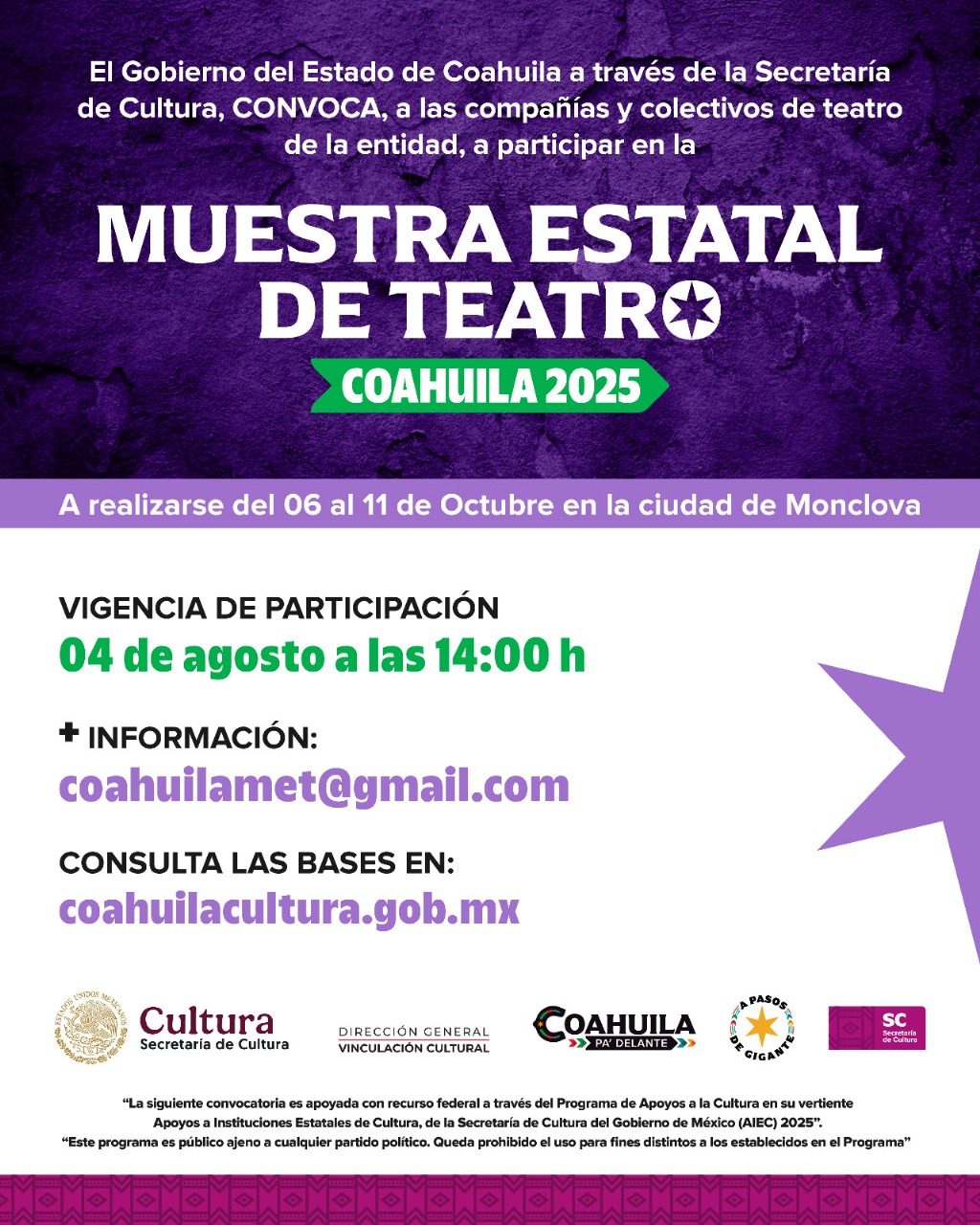 La Secretaría de Cultura de Coahuila invita a las y los interesados a consultar las bases completas de cada convocatoria y participar activamente en este proceso de impulso y visibilización del talento local.