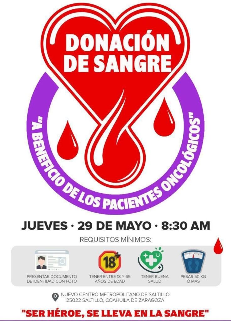Este jueves 29 de mayo, en instalaciones del Hospital Materno Infantil de Saltillo, tendrá lugar una campaña de donación de sangre, misma que se realizará en coordinación con el Centro Estatal de Transfusión Sanguínea de la Secretaría de Salud de Coahuila para beneficio de los niños con cáncer que son atendidos en esa institución médica.