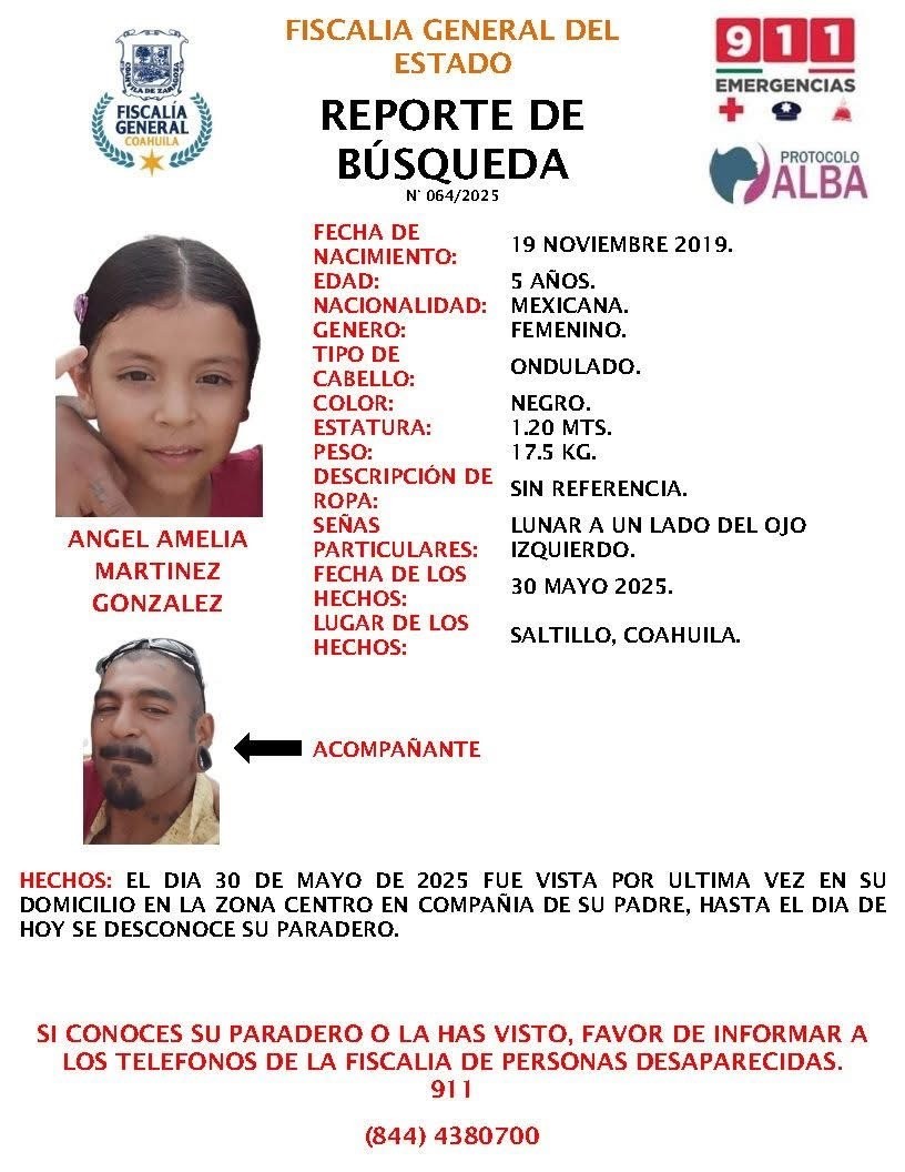 La Fiscalía General del Estado de Coahuila emitió un reporte de búsqueda para localizar a Ángel Amelia Martínez González, una menor de 5 años de edad que fue vista por última vez el pasado 30 de mayo de 2025 en su domicilio ubicado en la Zona Centro de Saltillo.