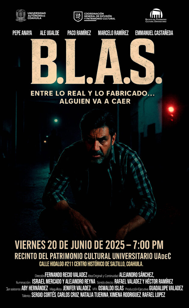 El próximo viernes 20 de junio la Universidad Autónoma de Coahuila a través de la Coordinación de Difusión y Patrimonio Cultural, invita a la proyección del cortometraje B.L.A.S. como parte de la exhibición de trabajos de los talleres culturales que se ofrecieron en el semestre enero-junio de 2025.