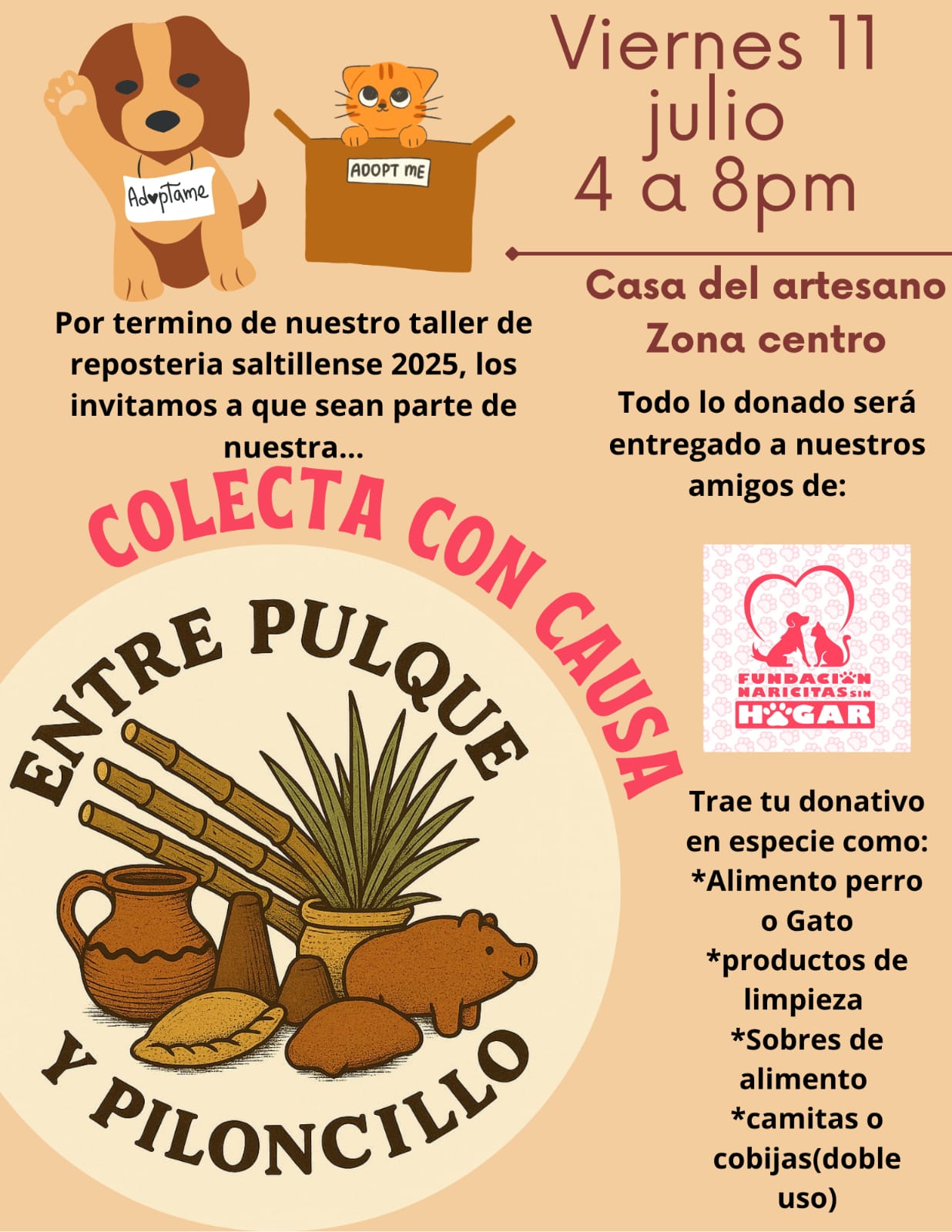 El próximo 11 de julio de este 2025, de 4 de la tarde a 8 de la noche, en la Casa del Artesano de Saltillo, el taller de repostería Artesanal «Entre Pulque y Piloncillo» llevará a cabo una colecta de alimento húmedo o seco a beneficio de los más de 30 perros y gatos que la Fundación Naricitas sin Hogar rescató de las calles y mantiene en refugios temporales.