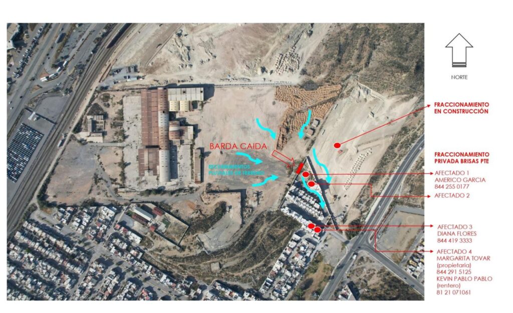 Un grupo de vecinos exhibieron a El Heraldo de Saltillo una problemática derivada de las pasadas lluvias por un fraccionamiento construido sin cumplir con infraestructura adecuada en el Blvd. Isidro López, a un costado de la colonia Brisas, en donde una barda se derrumbó por segunda ocasión. Esta barda se construyó por parte de un particular sin considerar obras adecuadas de drenaje, y ya el año pasado había ocasionado severos daños a las viviendas de los vecinos. Las pasadas lluvias volvieron a tirar el muro, atemorizando a los vecinos.