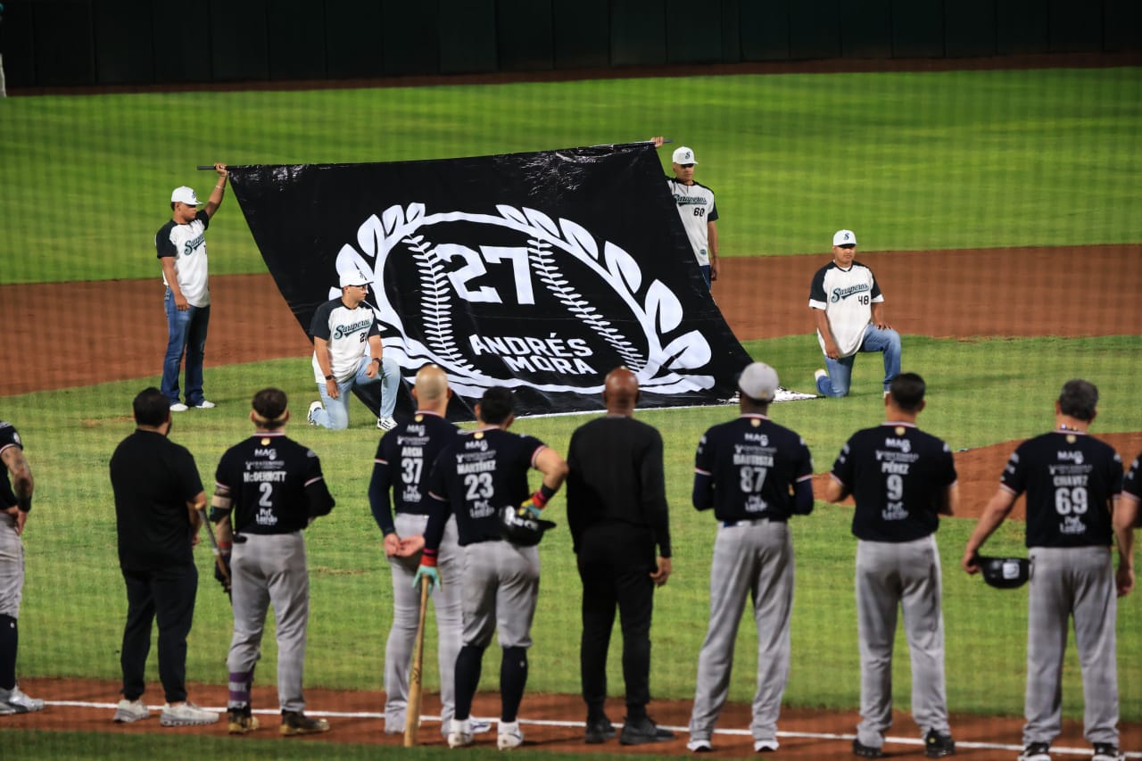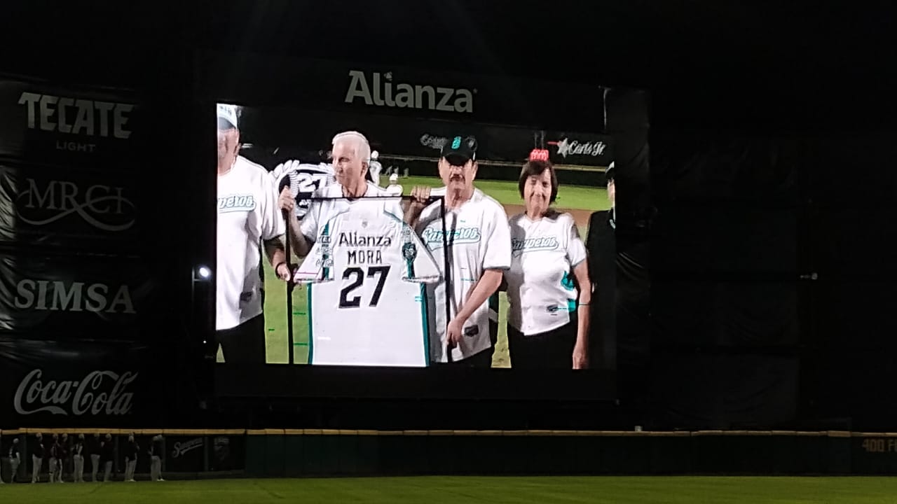 En una breve, pero significativa ceremonia, se realizó también el retiro del número 27 que distinguiera a Andrés Mora, quien de acuerdo con la directiva de la Nave Verde dejó una huella imborrable en la historia del club Saraperos de Saltillo.