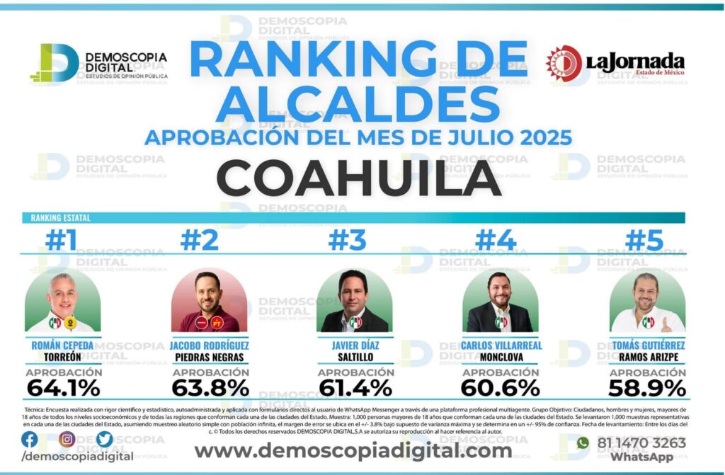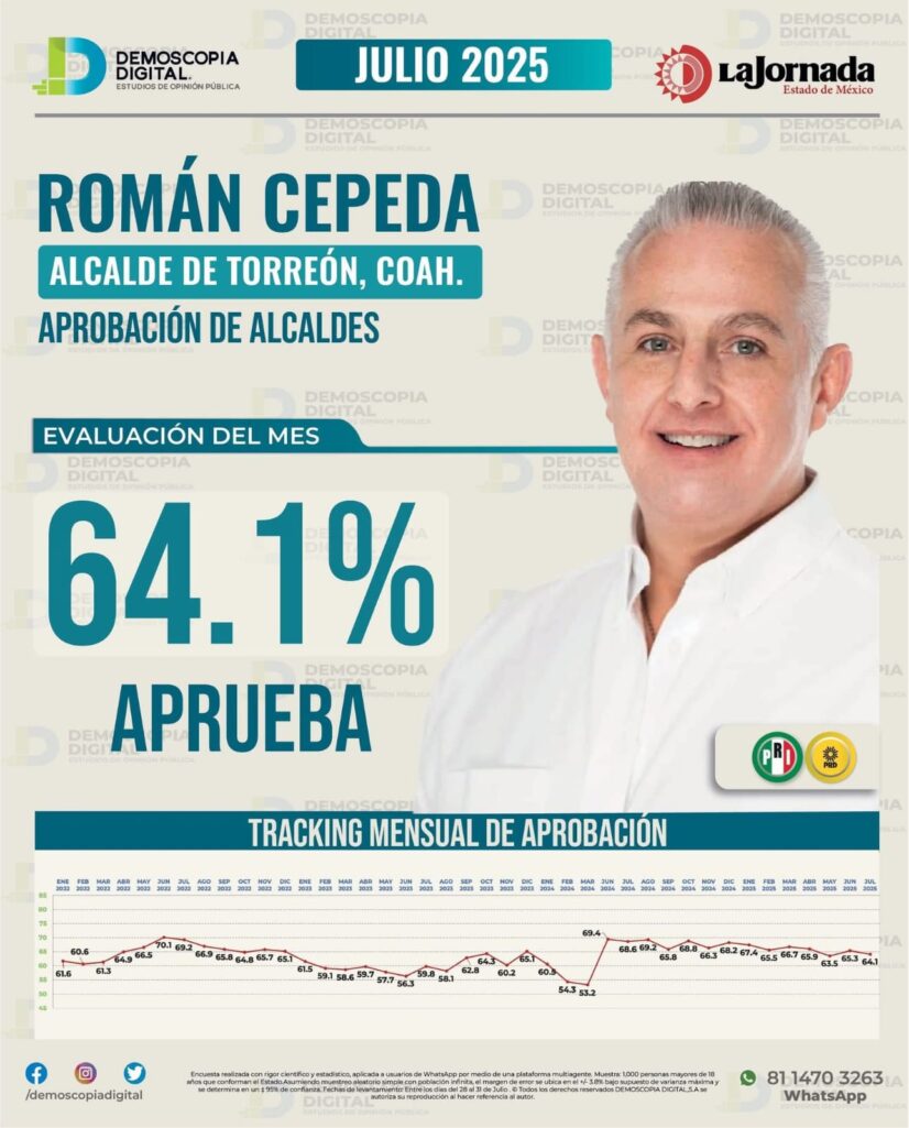 Con un 64.1 por ciento de aprobación ciudadana, el alcalde de Torreón, Román Alberto Cepeda González, encabeza la encuesta de aprobación de alcaldes del estado de Coahuila, realizada por Demoscopia Digital en el mes de julio de 2025.
