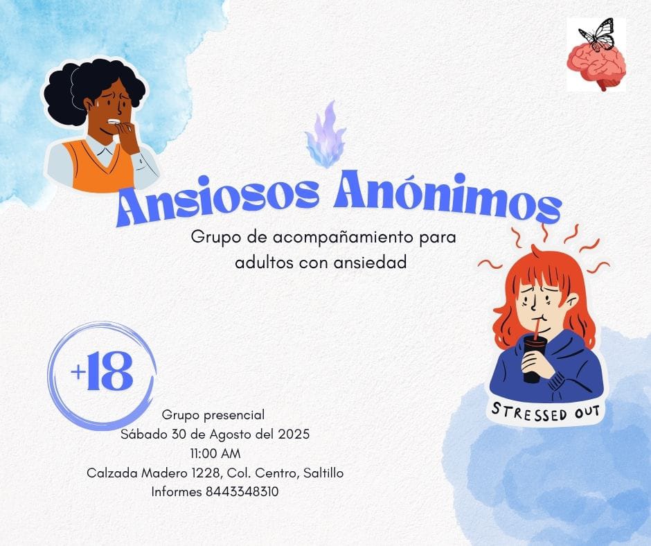 Con reuniones periódicas cada mes, Ansiosos Anónimos se formará, de inicio, por 20 personas de entre 18 a 38 años, siendo su primera sesión el próximo 30 de agosto de este 2025, a las 11 de la mañana, en un inmueble ubicado en Calzada Madero 1228, Zona Centro de Saltillo.